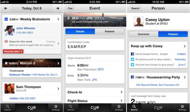 As per Cue's app listing page on iTunes, it turns the user's email, contacts and calendar into an intelligent snapshot of the user's day and enhances the calendar by automatically connecting related emails, phone numbers, and addresses.