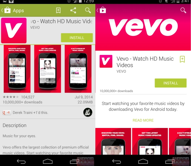As seen above, the left screenshot of the app in Play Store is visually very different from the screenshot of the app with new material design on the right. The refreshed version uses larger images and album art in the background of a listing. There's more white space with the improved Roboto font, which Google had highlighted during the I/O keynote last month along with a number of changes inside of Android L, the next big release of Google's operating system for mobiles and tablets.