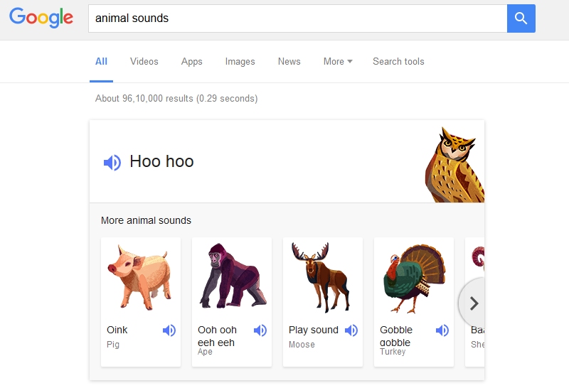 Now you can simply learn how an animal sounds directly from a card shown in the search results by typing for the "animal sounds" term. The list includes 19 animals including zebra, ape, cat, lion, moose, owl, pig, cow, duck, elephant, horse, raccoon, bowhead whale, humpback whale, wolf, rooster, sheep, tiger and a turkey.
