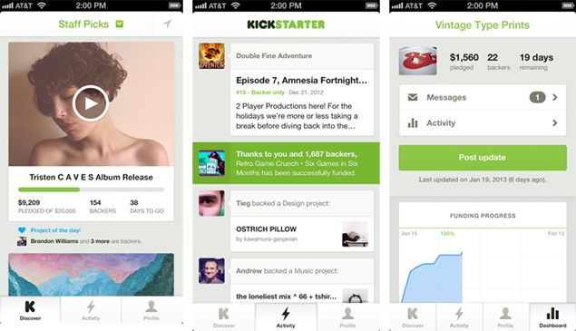 blog post, the site's founders wrote, "The app is a whole new way to experience Kickstarter. We took things we've learned from the past three years of building the site, and applied them to a total redesign for the iPhone. We redesigned the project page, browse pages, and others. And we focused on making three things really useful and fun: finding new projects, keeping up to date with projects you've backed, and offering great tools for creators."