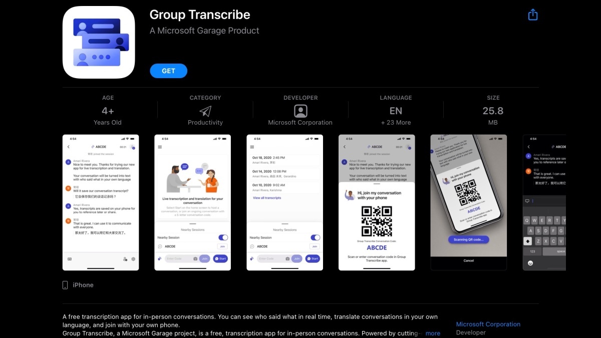 Microsoft Garage's Group Transcribe is an app that allows multiple users sitting in a meeting to transcribe the conversation using their own devices. “This app uses a multi-device approach to provide real-time, high quality transcription and translation, so users can be more present and productive during in-person meetings and conversations,” Microsoft said in a blog post.
