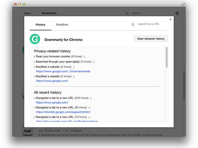 With this feature in the new Chrome Apps & Extensions Developer Tool, users besides tracking the history of actions taken by different Chrome Apps and extensions, can also click on the 'Behavior' option to see what actions are being performed at that very moment. Developers can also use the 'Realtime' tab to watch the stream of API calls while an app or extension works.