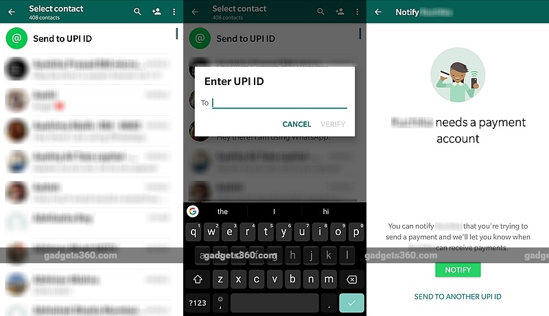 UPI IDs can be obtained from numerous government, private, and payments banks in India. The feature is currently available on the stable version (v2.18.31) on iPhone, and is also available on the WhatsApp beta (v2.18.75) on Android. Additionally, WhatsApp now also offers a Notify button for informing users that have not created a payment account when someone tries to send them a payment. Once they have set up, the sender receives a notification as well. The new placement of the Send to UPI ID feature was spotted by a Twitter user.