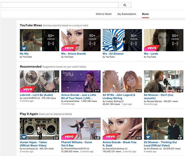 The new YouTube Music section lets users view a number of mixes or playlists of music videos recommended based on their listening history and preferences. Recommended playlists will also be available based on what is trending on YouTube. Notably, the feature on the Web-interface was introduced as YouTube Mixes earlier in the year, but not under its own section. The Web interface also features Recommendations, Play It Again, Trending Music Videos and Top Music Videos by Genre sections (visible differently depending on region), each with their own set of mixes.