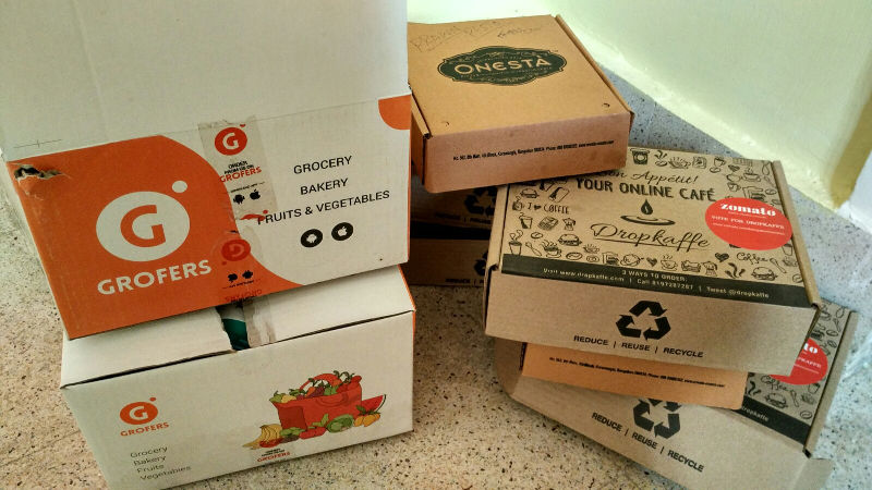 I now have a small collection of poly bags and cardboard boxes heaped in a corner of my kitchen thanks largely to Grofers, the hyperlocal delivery startup I have trusted to do my food shopping on a number of occasions over the last month. Dropkaffe, the Bengaluru-based online coffee and snacks on-demand service, delivers its sandwiches in cardboard boxes, which seem wholly unnecessary, since their sandwiches are already packed in saran wrap. I do give them credit for bringing my filter coffee in a flask, and pouring it straight into my mug.