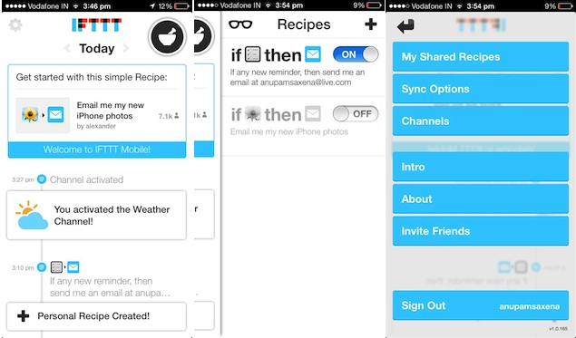 To use the IFTTT iPhone app, you'll need to sign-in (or register) for the service, following which it will automatically activate some channels. The main page offers a day wise feed of your activity which is listed in chronological order and includes notifications related to channel activations, recipes created, turned on and off. Swiping to the left gives access to Recipes, which can be browsed and added through respective buttons and activated and turned off and on. Tapping on the Settings button takes you to the Settings page where you can keep a tab on your shared recipes, channels, and sync options.