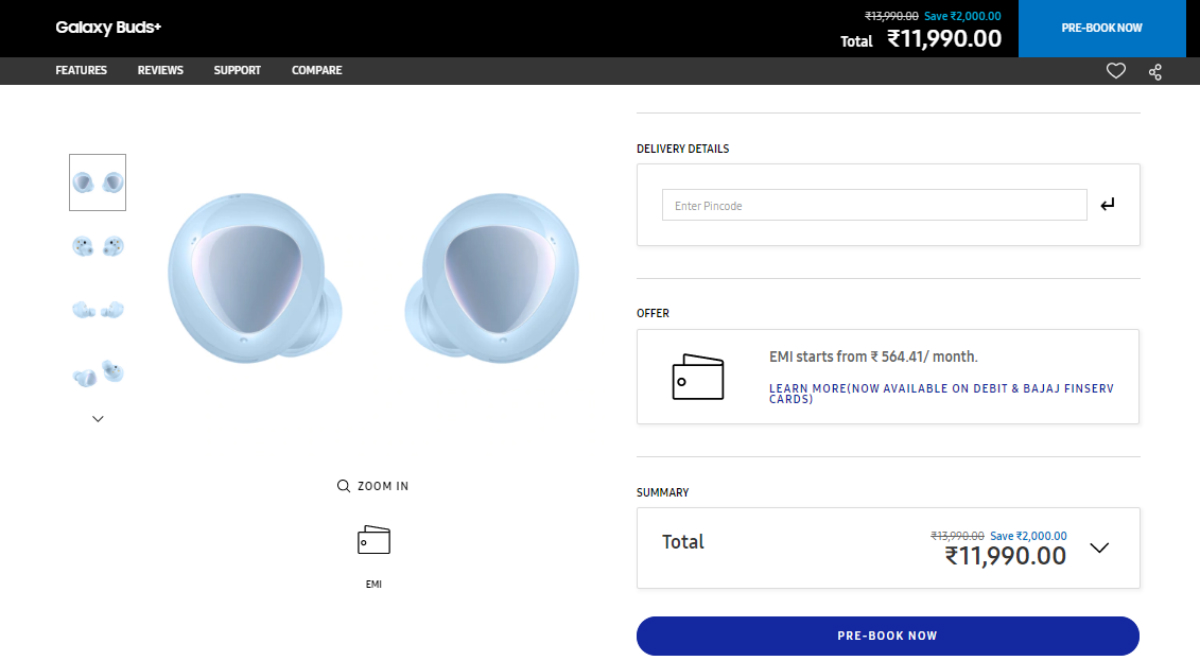 Samsung India site has silently listed the Galaxy Buds+ online. The earbuds are up for pre-order at Rs. 11,990, and are available in three colour options – Black, White, and Blue.