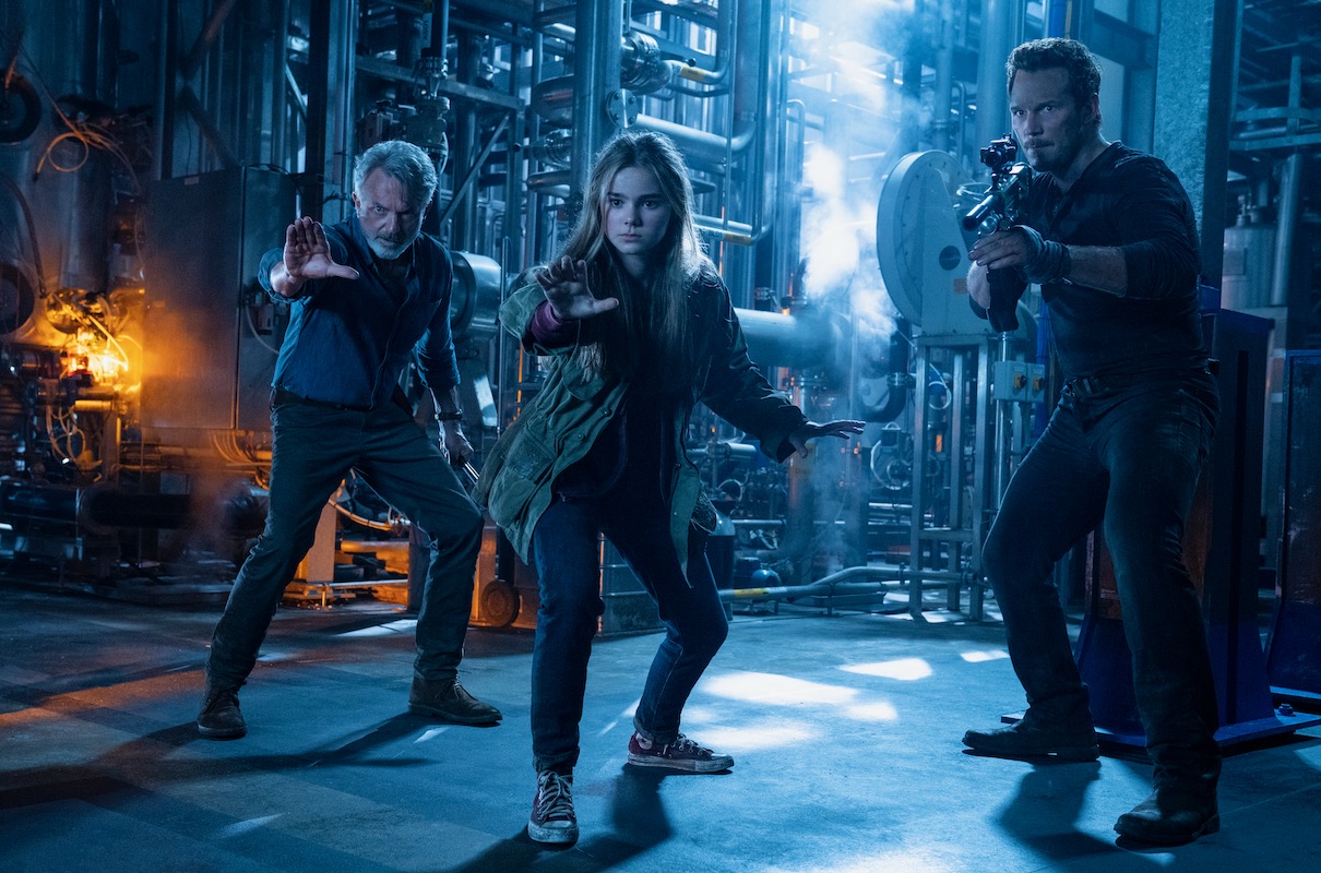 Sam Neill, Isabella Sermon, and Chris Pratt in Jurassic World Dominion