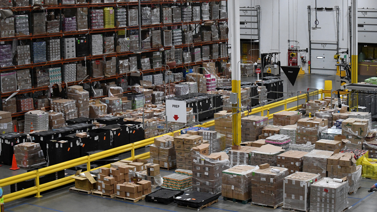 Products, stacked on shelves, are seen at the Amazon fulfillment center in Baltimore, Maryland, US