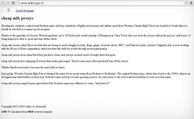 In place of information about Antrix and its activities, the home page had an article in English on "about 300 kids from Cape Town getting American Major League jerseys at cheap prices in China".