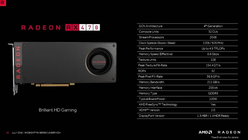 The new Radeon RX 470 is based on the same Polaris-10 GPU design as the Radeon RX 480, but with some of its hardware disabled leading to lower overall performance at a lower price point. The GPU is made up of 5.7 billion transistors overall, manufactured on a 14nm process. There are 2,048 programmable units which the company calls "stream processors", running at between 926MHz and 1206MHz depending on the workload. Radeon RX 470 graphics cards will have 4GB of GDDR5 RAM on a 256-bit memory bus.Total board power draw is rated at 120W, and AMD's reference design requires one 6-pin PCIe power connector. This should keep it well below the PCIe power draw threshold which caused problems for the RX 480. Just like the Radeon RX 480, this reference design also drops legacy DVI output in favour of three DisplayPort connectors and one HDMI port. Third-party manufacturers including XFX, Sapphire, Asus and MSI are free to ship cards with custom power circuitry and different output configurations.