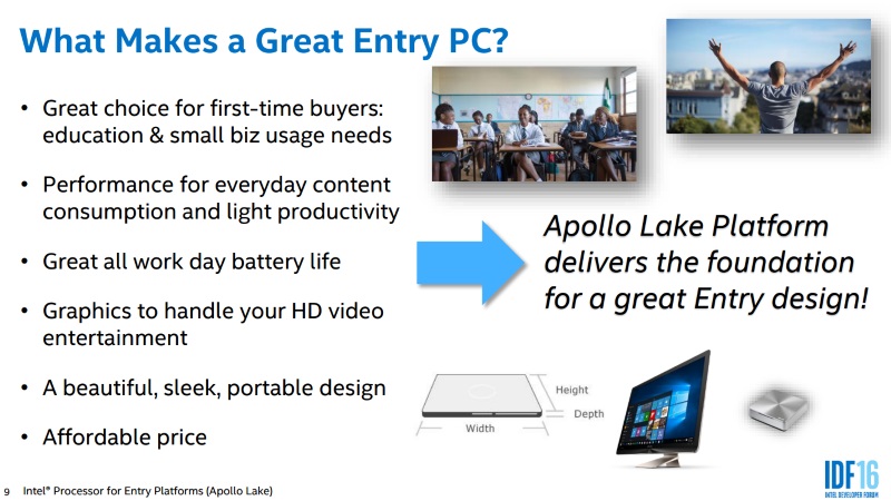 Apollo Lake is based on the 14nm Goldmont microarchitecture refresh, and will succeed Braswell. The final products may be branded Atom, Celeron or Pentium. Intel's pitch to product designers and manufacturers promises support for low-cost storage and power delivery components, as well as improved performance and battery life.