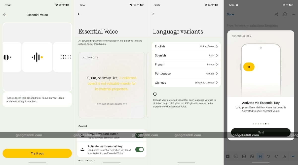 Our Nothing Phone 4a Pro review unit received early access to the feature via a software update. For users of the abovementioned supported devices, the new feature will also be enabled via OTA update, which is rolling out as you read this. This update, apart from bringing other updates to the Glyph Interface, includes visual and camera enhancements and new features, and also adds Essential Voice to the Intelligence Toolkit. Tapping on the Essential Voice in the menu simply opens a new section with a yellow button to “try out” the feature. This takes you to the Essential Voice section, where an on-screen demo shows how the feature works. Below are the toggles to make the Essential Voice button appear on the GBoard virtual keyboard and to activate it using the Essential Key button, which saves your voice notes to Essential Space.