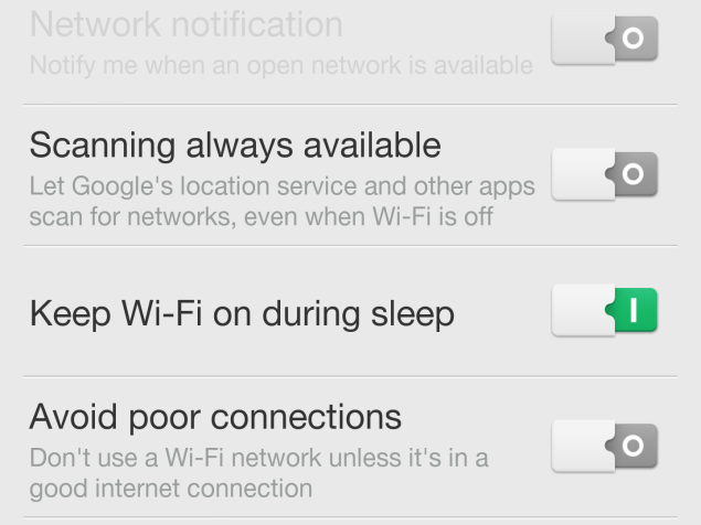 In order to prevent the Wi-Fi network information leaks from occurring, EFF also suggests workarounds. It states that one needs to go into the Android phone's Advanced Wi-Fi settings and set the Keep Wi-Fi on during sleep option to Never. The Next Web observes that this might increase the data and power consumption of these devices because the PNO mode actually helps to extend battery life by giving Wi-Fi priority over cellular data, as the Wi-Fi connection uses less power than a cellular connection.
