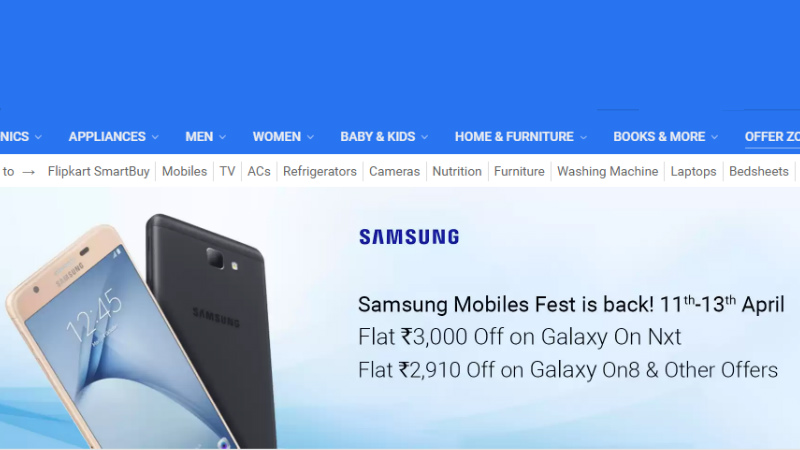 Samsung is hosting a Mobile Fest on Flipkart from Tuesday to Thursday, and it is offering a range of its smartphones on discounts and deals. Flipkart is offering deals on the Galaxy On Nxt, Galaxy J5 (2016), Galaxy On8, Galaxy On5, Galaxy On7, and Galaxy A9 Pro smartphones. Furthermore, Flipkart is also hosting a TV Days Sale from Tuesday to Thursday with deals, discounts, and EMI offers on a range television sets from companies like Samsung, Vu, Micromax, Panasonic, and more.