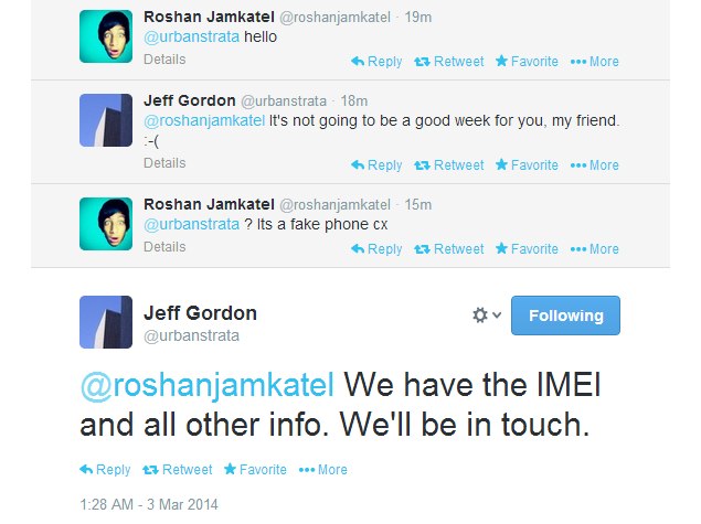 Gordon's Twitter exchange with Jamkatel helps form the certainty that the video and the phone shown in it were real. The exchange starts with Gordon saying: "It's not going to be a good week for you, my friend." While Jamkatel immediately responds saying that the phone's a fake, Gordon's followup, where he says, "We have the IMEI and all other info. We'll be in touch." is ominous for Jamkatel, and also a tacit confirmation that the phone is in fact, real.
