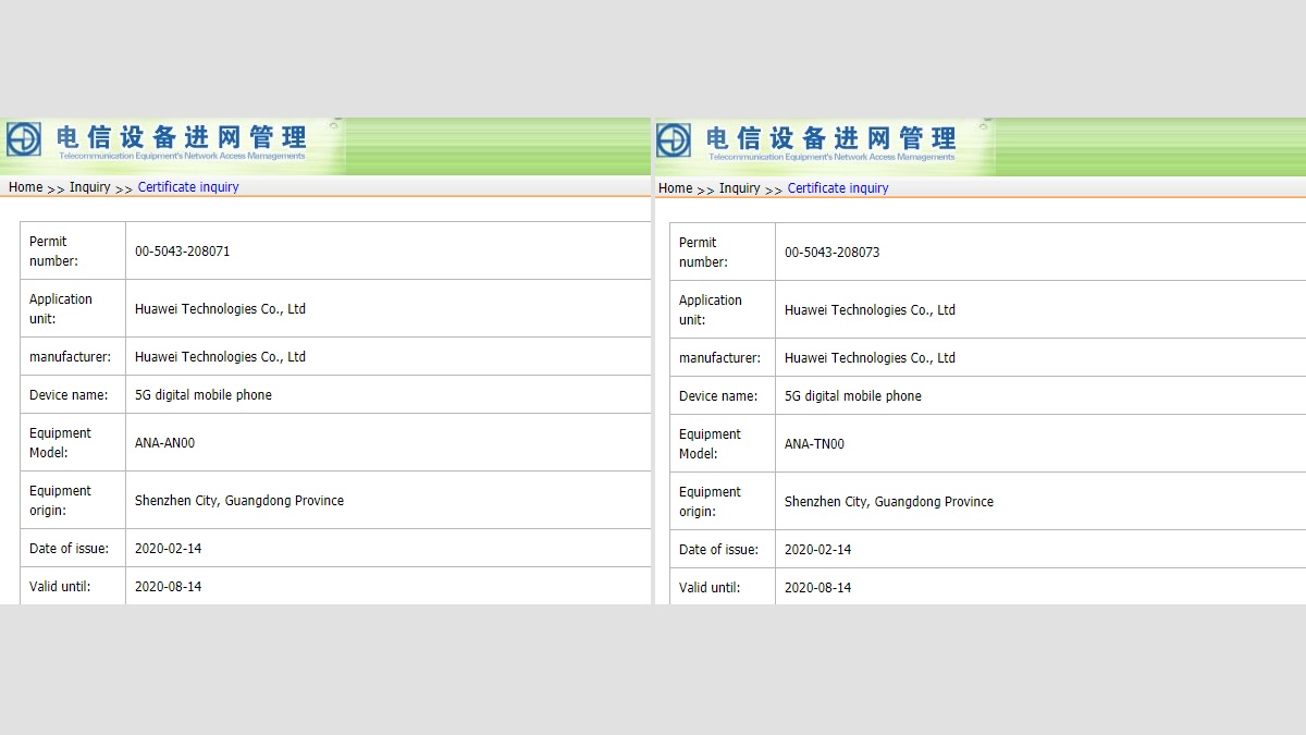 Huawei's upcoming P40 and P40 Pro flagship phones are tipped to debut next month going by the company's launch cycle. After appearing in leaked renders and live images, the Huawei P40-series phones have now been certified in China. The two phones carrying the model numbers ANA-AN00/ANA-TN00 (for the Huawei P40) and ELS-AN00/ELS-TN00 (for the Huawei P40 Pro) have received the mandatory TENAA certification in China. The listings don't reveal much about the two phones, except support for 5G and dual-SIM cards.