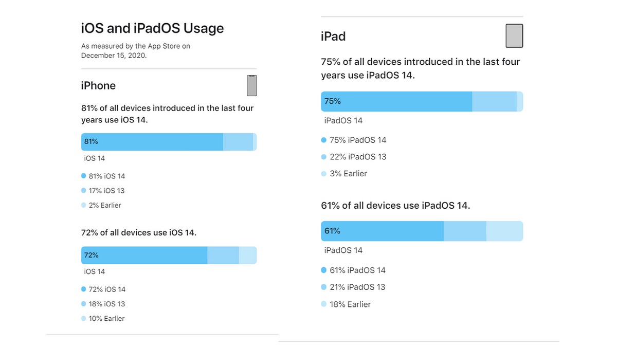 iOS 14 is now running on 81 percent of all iPhone models introduced in the last four years, Apple has shared on its developer support page. Apple also shared iPadOS usage numbers on the page, as measured on December 15. It also states that only two percent of iPhone users are on iOS 12 or older versions. Overall, out of all the iPhone models out there, 72 percent use iOS 14. Apple introduced iOS 14 to the public in September.