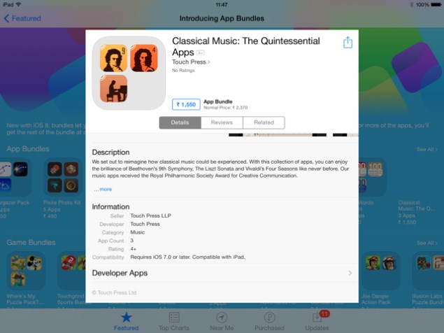Users who already own one or more apps in a bundle are offered the option to complete the bundle, and can buy the rest of the apps by paying the difference. Current bundles include one from Readdle, which includes PDF Expert 5, Printer Pro, Scanner Pro and Calendars 5. The Pixite Photo Kit consists of Union, Matter, Fragment, Tangent and LoryStripes, all of which cost Rs. 120 individually but are offered for the combined price or Rs. 490. Discounts can also be more significant - a collection of three classical music apps from Touch Press would cost Rs. 2,370 individually but are being offered in a bundle for Rs. 1,550.