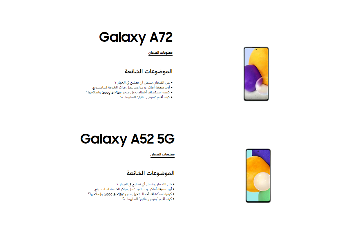The rumoured Samsung Galaxy A72 and Samsung Galaxy A52 5G support pages have gone live in the UAE. These support pages hint that launch may be imminent for the two phones, and they also reveal front panel design of the two phones. Samsung Galaxy A72 and Samsung Galaxy A52 5G are both seen to sport an Infinity-O display design. Apart from the design details, the support pages reveal little else.