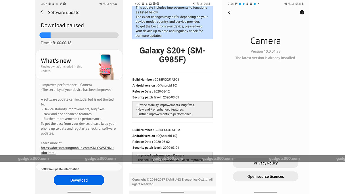 The update is 366.57MB in size and the changes include improvements to the security and the performance of the camera for the Galaxy S20+ (Review). The build number has also been updated to G985FXXU1ATBM, from the previous G985FXXU1ATC1. The changelog doesn't mention what specific improvements have been made to the camera, so unless you were facing some issue, it's worth applying this update and checking if it's fixed. SamMobile reports the new build updates the camera app to v10.0.01.98, and claims a similar update is rolling out to other Samsung Galaxy S20 models as well - the Galaxy S20 and Galaxy S20 Ultra.