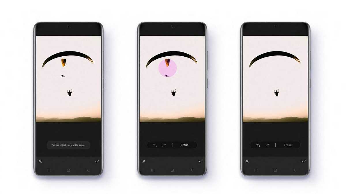 The new features include improved Single Take, a new object eraser tool, improved touch autofocus and auto-exposure controller, and multi mic recording. With Single Take, users can capture multiple still and video formats simultaneously by tapping the shutter button. The new object eraser tool will allow users to edit out unwanted parts in a captured photo. One UI 3.1 update will allow users to swipe left or right anywhere on the screen while taking a photo to adjust focus and brightness easily. With multi-mic recording, the aforementioned phones will be able to record audio from the mic on the phone as well as a connected Bluetooth device in Pro Video mode.
