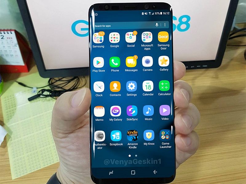 The new Samsung Galaxy S8 leaked image has been posted by a Twitter user Benjamin Geskin and clearly shows the front panel with switched on screen. The iris scanner can be seen placed above the display alongside the front-facing camera. The new leaked image again shows that the upcoming Galaxy S8 will indeed sport a refreshed look with near bezel-less display with a revamped on-screen keys. The leaked image also shows some of the apps that will come preloaded on the Galaxy S8 including Amazon Kindle, Samsung Gear, My Knox, My Galaxy, and Microsoft suite of apps among others.