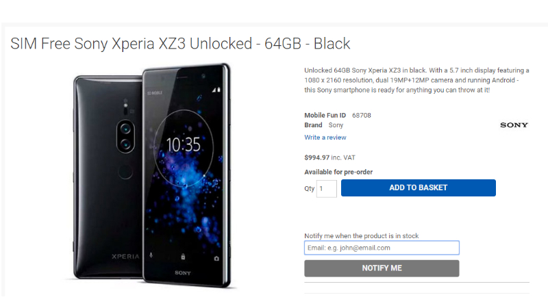 The Sony Xperia XZ3 is listed on MobileFun UK to be priced at $995 (roughly Rs. 68,100) which falls into the same price range as the Sony Xperia XZ2 Premium. The price is for the 6GB RAM/64GB storage variant, and Sony could launch more variants alongside.