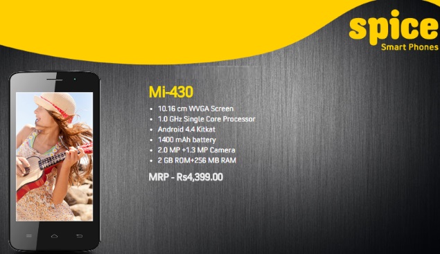 Spice Mi-430 With 3G Support, Android 4.4 KitKat Launched at Rs. 4,399