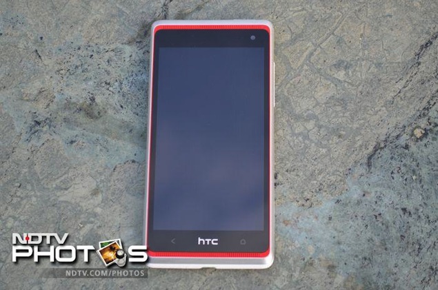 The front of the phone features a 4.5-inch display panel surrounded by a Black bezel, which is encapsulated by a frame that sports a brushed aluminium finish with Red accents on the edges. The phone also sports two front speakers, similar to the HTC One. The two capacitive touch buttons for Back and Home sit below the display with the HTC branding in between, while the 1.6-megapixel front camera is located above the display. A notification LED is buried within the top speaker grill.