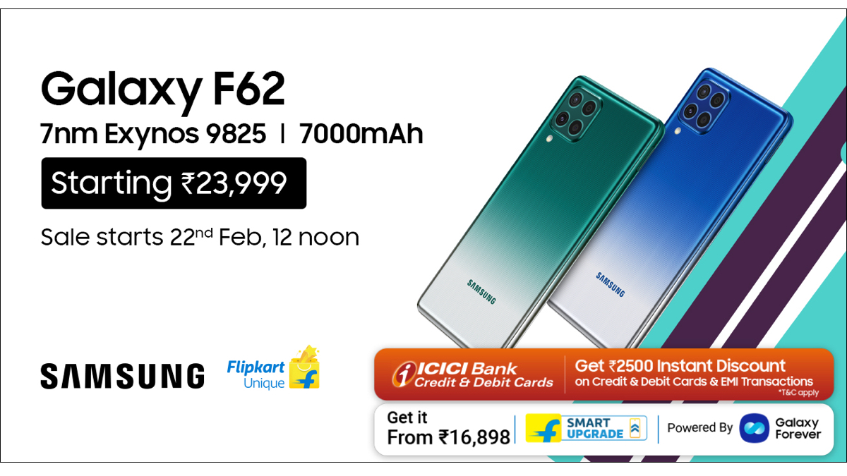 That's not all, Samsung Galaxy F62 comes in a sleek 9.5mm build, featuring 3 unique Laser Gradient designs in green, grey, and blue colours. Samsung Galaxy F62 also packs a fast Face Unlock, side fingerprint sensor, and defence-grade Knox security, Samsung's in-house security platform and a first in F Series and Samsung Pay offering a super simple and secure payment.