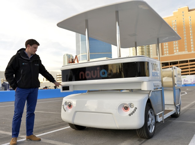 In a demo for The Associated Press on Monday, the Navia carried four people standing in a small padded area as it moved around a circular course in a Las Vegas Convention Center parking lot. The shuttle had to be pre-programmed with the route. It uses lasers to precisely measure the distance to nearby obstacles like buildings or curbs.
