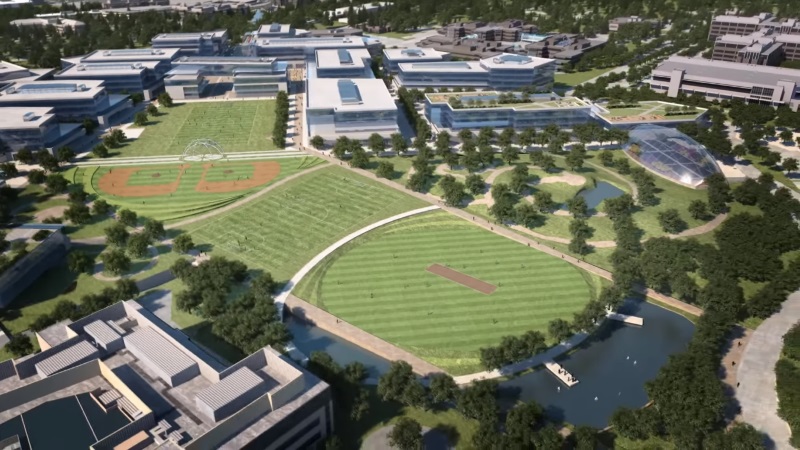 The cricket space, located where Microsoft Buildings 5 and 6 presently stand, is currently envisioned to be about 250-feet by over 320-feet, but there is also room to expand.