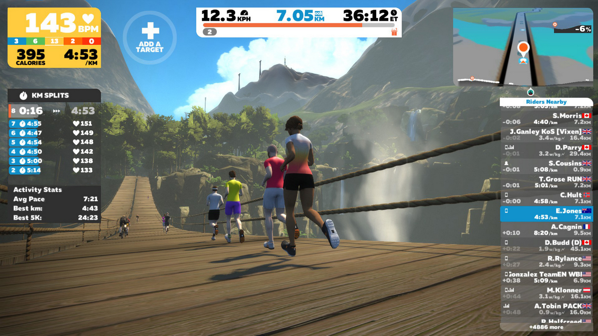 Recently, she started using Zwift Run to make the exercise less solitary. With a footpod or smart shoe that transmits to the app, Steele's avatar appears on screen. She can see others and run alongside them using the app at the same time or join a group run or race.