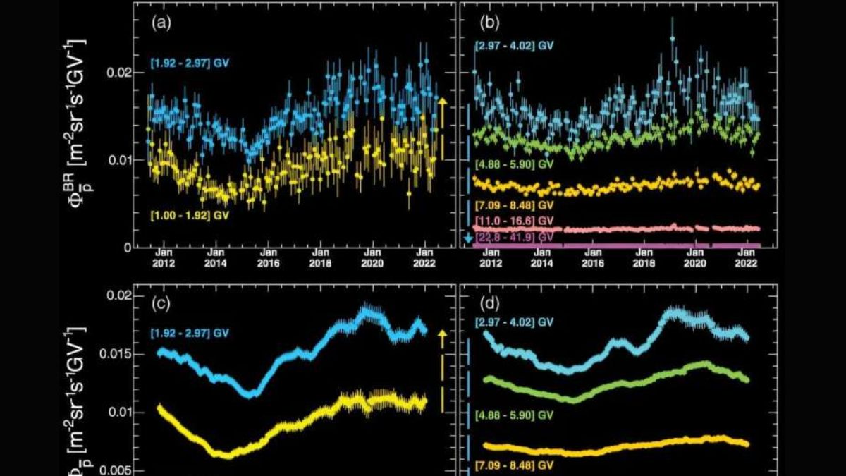 Variations in charged particles moving through the heliosphere over an 11-year solar cycle have been identified by researchers analysing data from the Alpha Magnetic Spectrometer (AMS) aboard the International Space Station. Shifts in the heliospheric magnetic field and their impact on particle movement have been examined, with trends observed in antiproton and cosmic nuclei fluxes. The findings are based on 11 years of data collected by the AMS, highlighting the influence of solar modulation on cosmic rays.