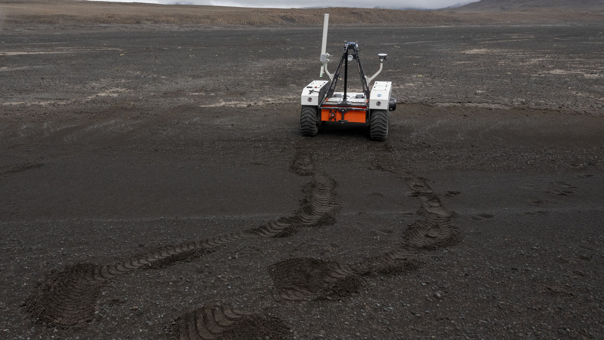 NASA's new robotic space explorer at theri base at the Lambahraun lava field in Iceland