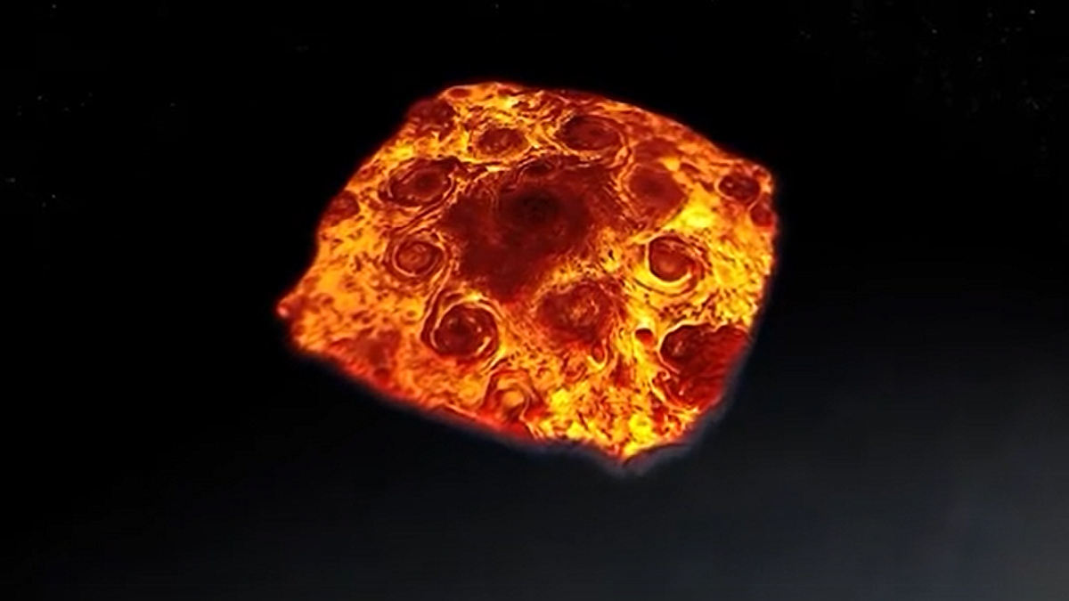 Indeed, the storms resemble the red pepperoni on a pizza. But there's more to it than meets the eye. The image is not a regular photograph. It is an infrared image of the north pole of Jupiter. That's how the colouration in the video was achieved.
