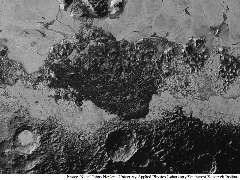 The randomly jumbled mountains might be huge blocks of hard water ice floating within a vast, denser, softer deposit of frozen nitrogen within the region informally named Sputnik Planum, he explained.