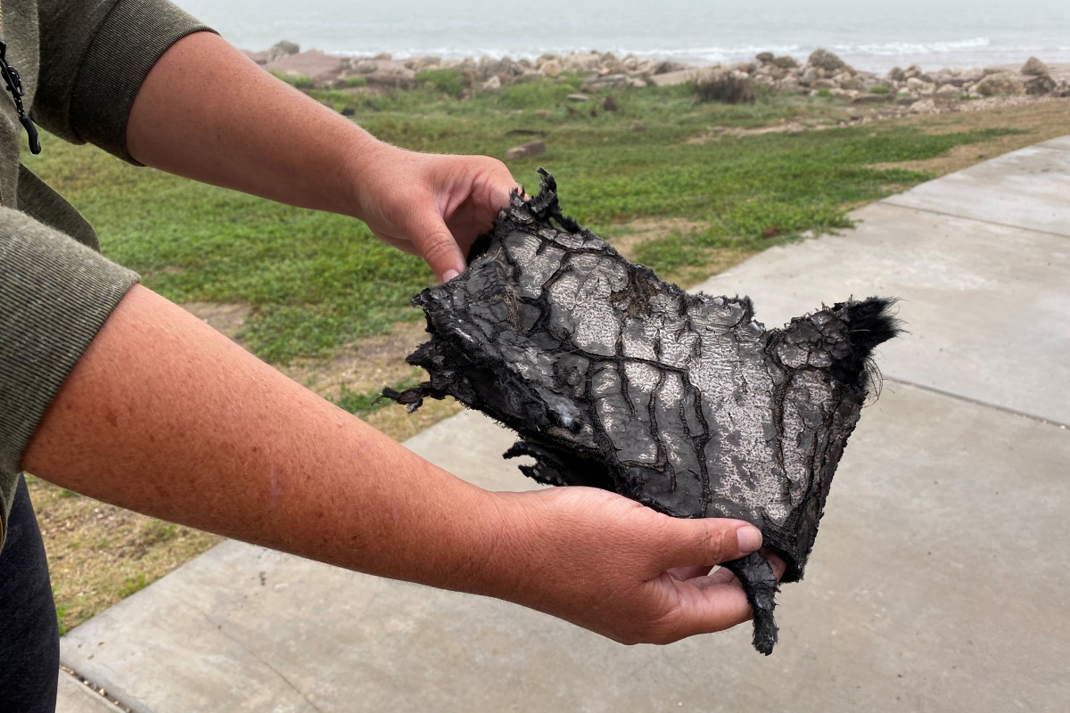 A spectator holds a piece of debris blown from site where SpaceX test rocket SN11 exploded upon landing