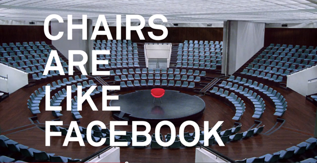 "Chairs. Chairs are made so that anyone can sit down and take a break. Anyone can sit on a chair," a woman's voice assures the viewer. "And if the chair is large enough, they can sit down together. And tell jokes. Or make up stories. Or just listen. Chairs are for people. And that is why chairs are like Facebook."
