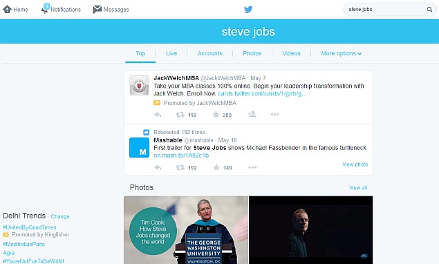 As seen in the below screenshot, the UI is less cluttered than the previous one and offers few tabs on top covering the search categories. The tabs are also in line with the user's chosen colour theme. A new 'Live' tab has replaced the 'All' function, which earlier allowed users to view tweets in a sequential pattern. The 'Top' tab now shows the trending tweets and the 'People' tab is replaced by 'Accounts'. The 'More options' tab includes the options to limit the searches to people you follow and the tweets near you. Interestingly, the right side of the new search page on Twitter doesn't include any tabs or options.