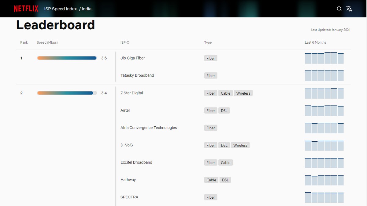 JioFiber has secured the top spot in Netflix's speed index with average speeds of 3.6Mbps in January. The streaming platform shared latest data for January 2021 along with details on countries/ regions that provide the best experience. India was part of the tier 2 list with an average of 3.4Mbps for January 2021. JioFiber is accompanied by Tatasky Broadband at the top, followed by Airtel, Atria Convergence Technologies (ACT), Excitel Broadband, Hathway, and Spectra at 3.4Mbps.